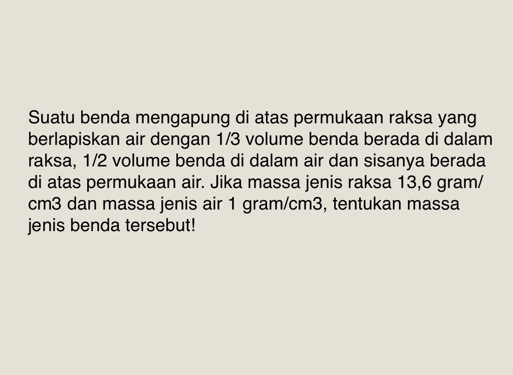 Suatu benda mengapung di atas permukaan raksa yang berlapiskan air dengan 1/3 volume benda berada di dalam raksa, 1/2 volume benda di dalam air dan sisanya berada di atas permukaan air. Jika massa jenis raksa 13,6 gram/cm3 dan massa jenis air 1 gram/cm3, tentukan massa jenis benda tersebut!