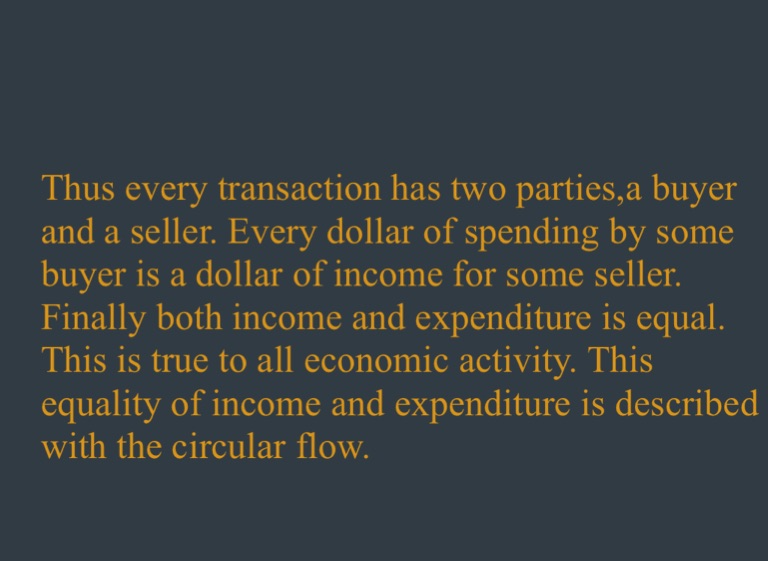 Thus every transaction has two parties,a buyer and a seller. Every dollar of spending by some buyer is a dollar of income for some seller. Finally both income and expenditure is equal. This is true to all economic activity. This equality of income and expenditure is described with the circular flow.