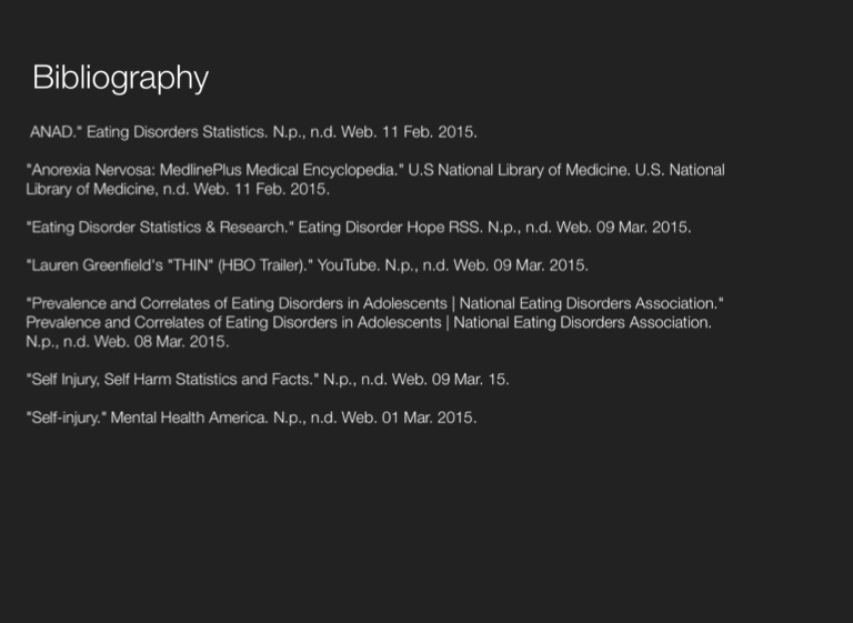 "Anorexia Nervosa: MedlinePlus Medical Encyclopedia." U.S National Library of Medicine. U.S. National Library of Medicine, n.d. Web. 11 Feb. 2015.