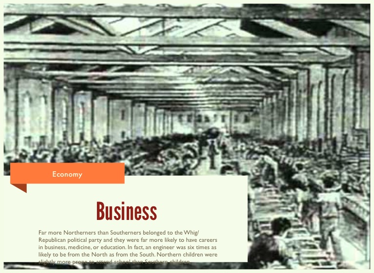 Far more Northerners than Southerners belonged to the Whig/Republican political party and they were far more likely to have careers in business, medicine, or education. In fact, an engineer was six times as likely to be from the North as from the South. Northern children were slightly more prone to attend school than Southern children.