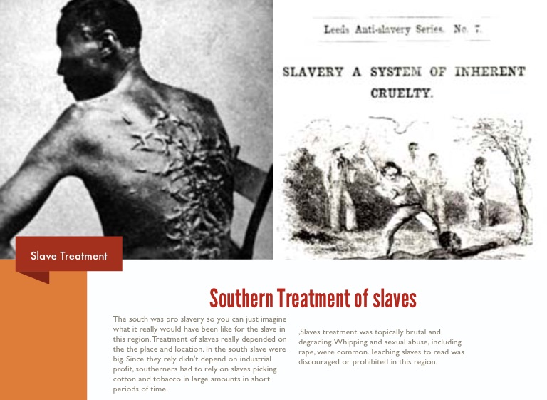 The south was pro slavery so you can just imagine what it really would have been like for the slave in this region. Treatment of slaves really depended on the the place and location. In the south slave were big. Since they rely didn't depend on industrial profit, southerners had to rely on slaves picking cotton and tobacco in large amounts in short periods of time.