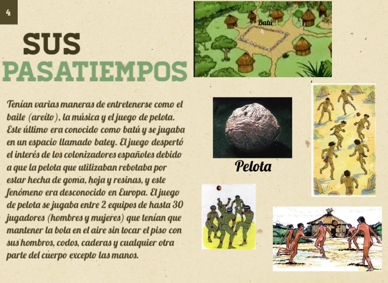 Tenían varias maneras de entretenerse como el baile (areíto), la música y el juego de pelota. Este último era conocido como batú y se jugaba en un espacio llamado batey. El juego despertó el interés de los colonizadores españoles debido a que la pelota que utilizaban rebotaba por estar hecha de goma, hoja y resinas, y este fenómeno era desconocido en Europa. El juego de pelota se jugaba entre 2 equipos de hasta 30 jugadores (hombres y mujeres) que tenían que mantener la bola en el aire sin tocar el piso con sus hombros, codos, caderas y cualquier otra parte del cuerpo excepto las manos.