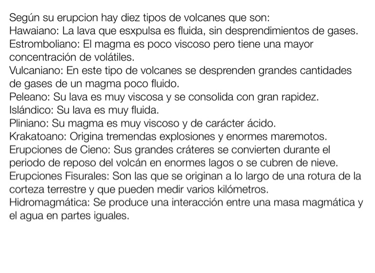 Según su erupcion hay diez tipos de volcanes que son: