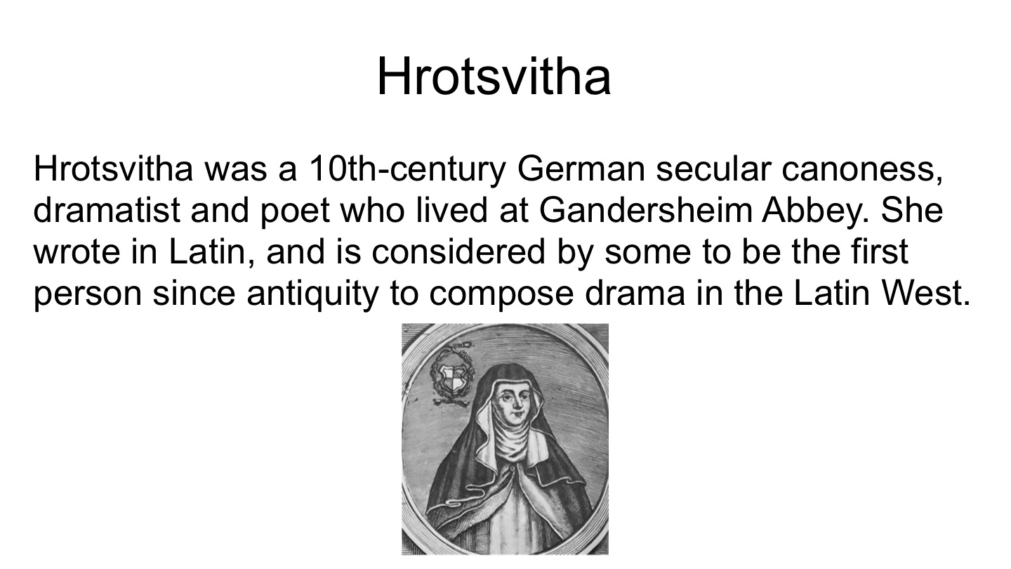 Hrotsvitha was a 10th-century German secular canoness, dramatist and poet who lived at Gandersheim Abbey. She wrote in Latin, and is considered by some to be the first person since antiquity to compose drama in the Latin West.
