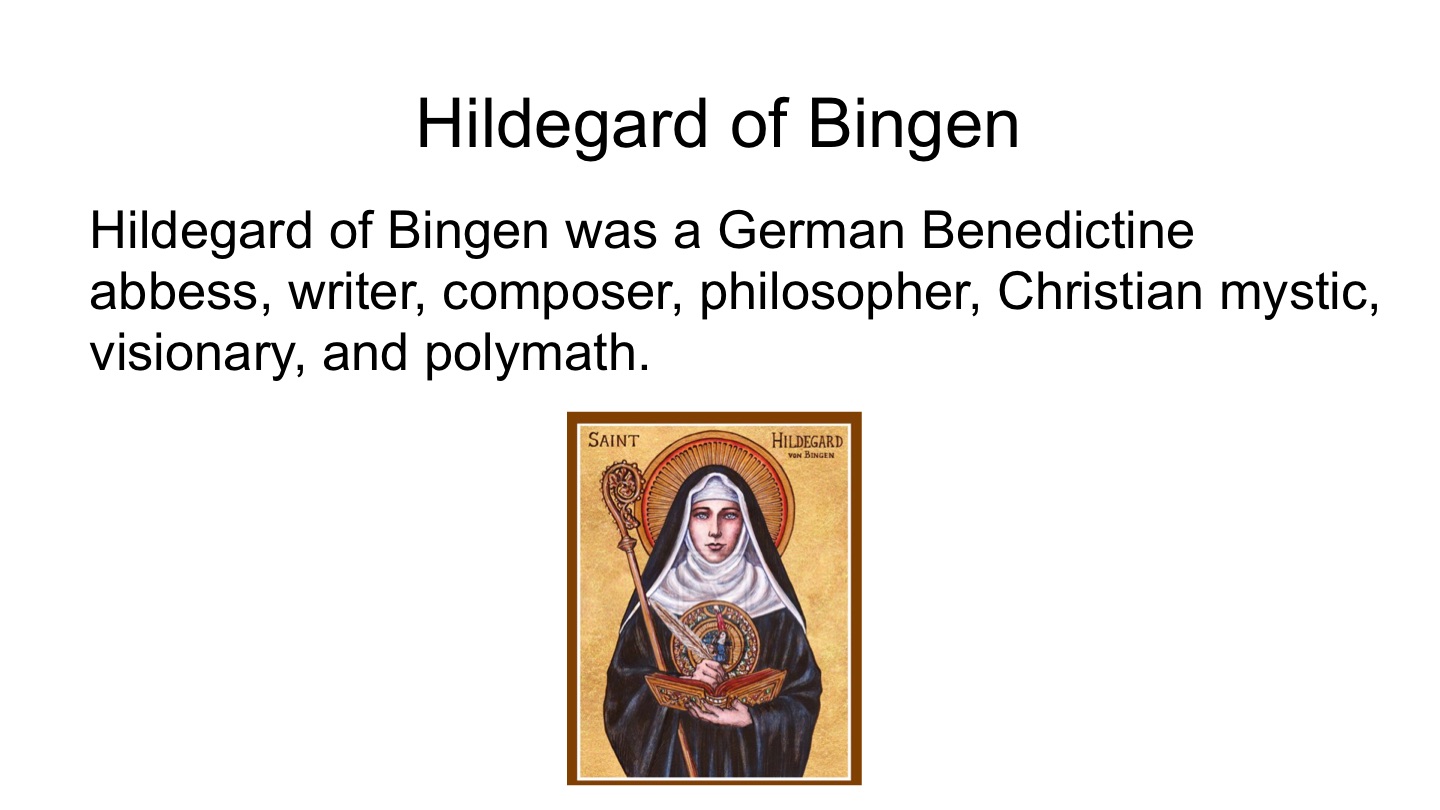 Hildegard of Bingen was a German Benedictine abbess, writer, composer, philosopher, Christian mystic, visionary, and polymath.