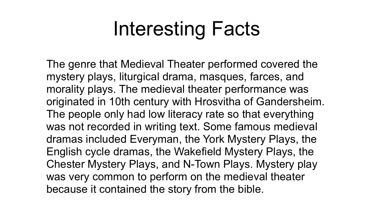 The genre that Medieval Theater performed covered the mystery plays, liturgical drama, masques, farces, and morality plays. The medieval theater performance was originated in 10th century with Hrosvitha of Gandersheim. The people only had low literacy rate so that everything was not recorded in writing text. Some famous medieval dramas included Everyman, the York Mystery Plays, the English cycle dramas, the Wakefield Mystery Plays, the Chester Mystery Plays, and N-Town Plays. Mystery play was very common to perform on the medieval theater because it contained the story from the bible.