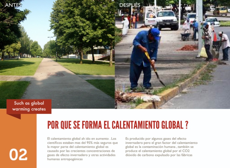 El calentamiento global ah ido en aumento . Los científicos estaban mas del 95% más seguros que la mayor parte del calentamiento global es causado por las crecientes concentraciones de gases de efecto invernadero y otras actividades humanas antropogénicas
