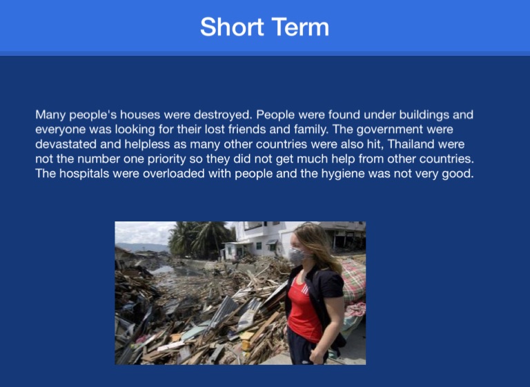 Many people's houses were destroyed. People were found under buildings and everyone was looking for their lost friends and family. The government were devastated and helpless as many other countries were also hit, Thailand were not the number one priority so they did not get much help from other countries. The hospitals were overloaded with people and the hygiene was not very good.