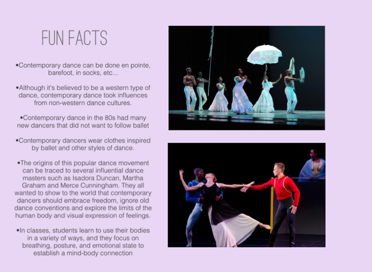 •Although it's believed to be a western type of dance, contemporary dance took influences from non-western dance cultures.
