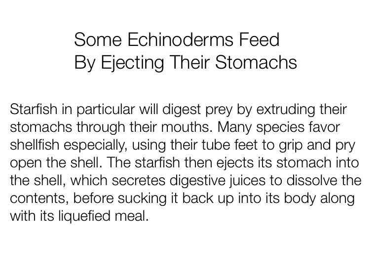 Starfish in particular will digest prey by extruding their stomachs through their mouths. Many species favor shellfish especially, using their tube feet to grip and pry open the shell. The starfish then ejects its stomach into the shell, which secretes digestive juices to dissolve the contents, before sucking it back up into its body along with its liquefied meal.