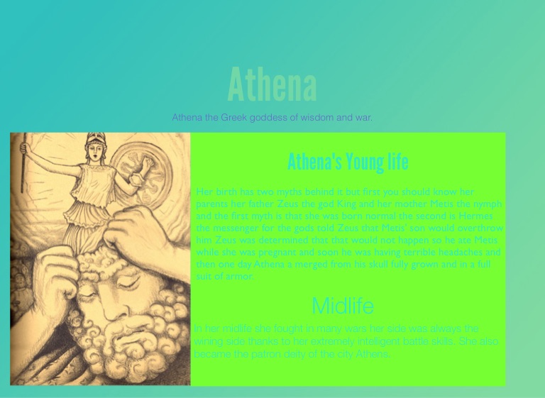 In her midlife she fought in many wars her side was always the wining side thanks to her extremely intelligent battle skills. She also became the patron deity of the city Athens.