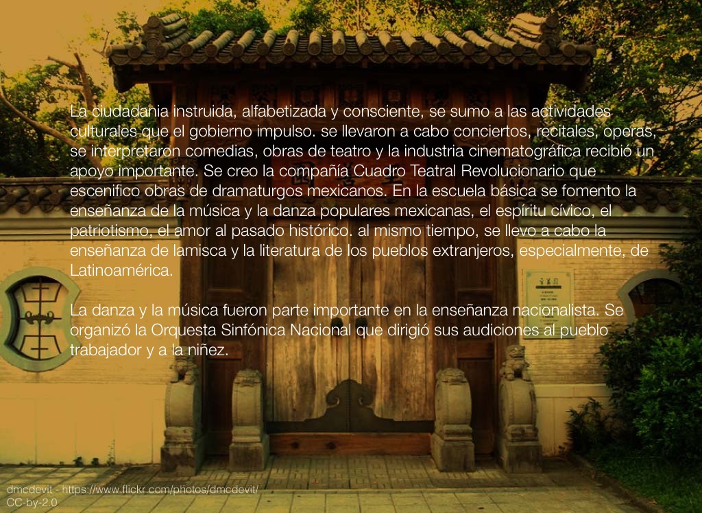 La ciudadania instruida, alfabetizada y consciente, se sumo a las actividades culturales que el gobierno impulso. se llevaron a cabo conciertos, recitales, operas, se interpretaron comedias, obras de teatro y la industria cinematográfica recibió un apoyo importante. Se creo la compañía Cuadro Teatral Revolucionario que escenifico obras de dramaturgos mexicanos. En la escuela básica se fomento la enseñanza de la música y la danza populares mexicanas, el espíritu cívico, el patriotismo, el amor al pasado histórico. al mismo tiempo, se llevo a cabo la enseñanza de lamisca y la literatura de los pueblos extranjeros, especialmente, de Latinoamérica.