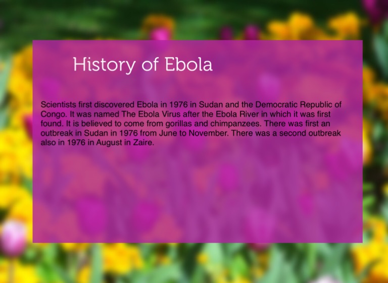 Scientists first discovered Ebola in 1976 in Sudan and the Democratic Republic of Congo. It was named The Ebola Virus after the Ebola River in which it was first found. It is believed to come from gorillas and chimpanzees. There was first an outbreak in Sudan in 1976 from June to November. There was a second outbreak also in 1976 in August in Zaire.