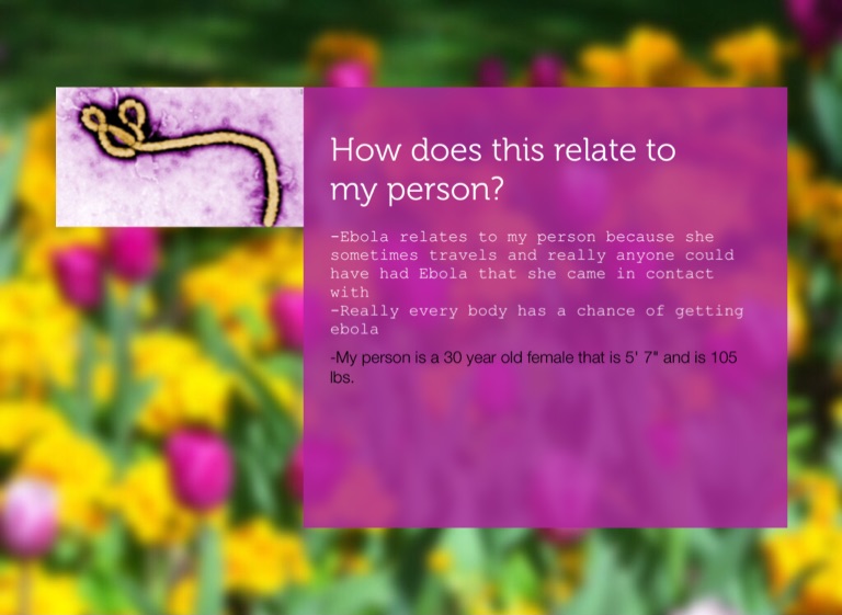 -Ebola relates to my person because she sometimes travels and really anyone could have had Ebola that she came in contact with