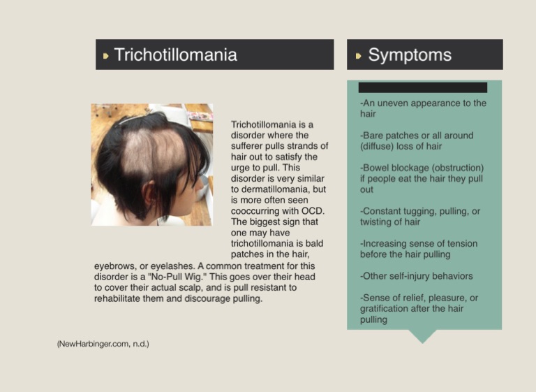 Trichotillomania is a disorder where the sufferer pulls strands of hair out to satisfy the urge to pull. This disorder is very similar to dermatillomania, but is more often seen cooccurring with OCD. The biggest sign that one may have trichotillomania is bald patches in the hair,