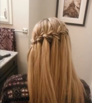 The girl's hairstyle is called a waterfall braid, an easily done braid that wraps sturdily around the head as shown on left. The girls would also curl their hair.