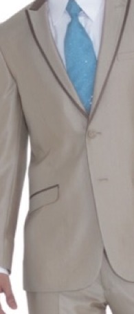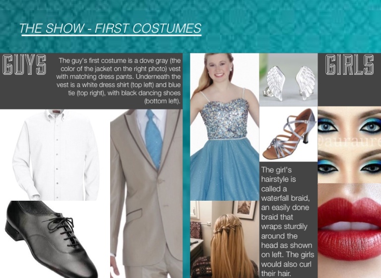 The guy's first costume is a dove gray (the color of the jacket on the right photo) vest with matching dress pants. Underneath the vest is a white dress shirt (top left) and blue tie (top right), with black dancing shoes (bottom left).