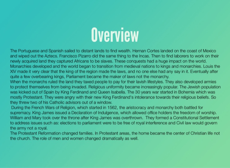 The Portuguese and Spanish sailed to distant lands to find wealth. Hernan Cortes landed on the coast of Mexico and wiped out the Aztecs. Francisco Pizarro did the same thing to the Incas. Then to find laborers to work on their newly acquired land they captured Africans to be slaves. These conquests had a huge impact on the world. Monarchies developed and the world began to transition from medieval nations to kings and monarchies. Louis the XIV made it very clear that the king of the region made the laws, and no one else had any say in it. Eventually after quite a few overbearing kings, Parliament became the maker of laws not the monarchy.