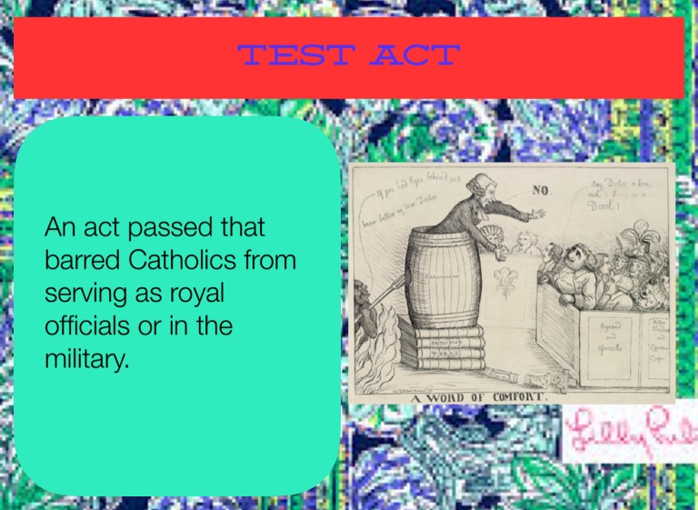 An act passed that barred Catholics from serving as royal officials or in the military.