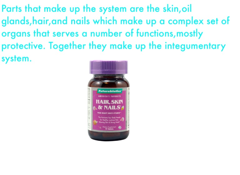 Parts that make up the system are the skin,oil glands,hair,and nails which make up a complex set of organs that serves a number of functions,mostly protective. Together they make up the integumentary system.