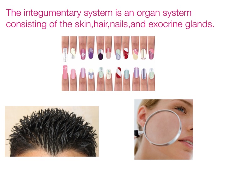 The integumentary system is an organ system consisting of the skin,hair,nails,and exocrine glands.