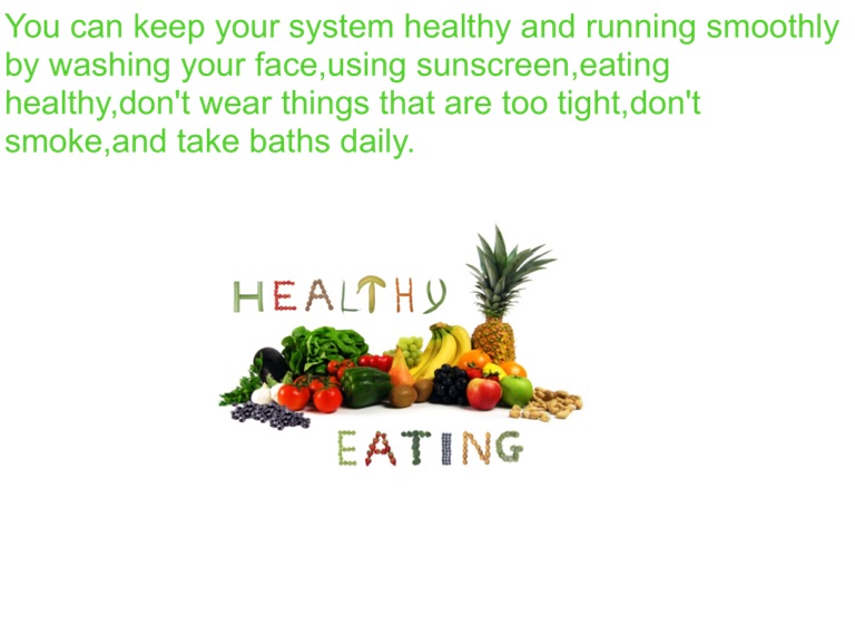 You can keep your system healthy and running smoothly by washing your face,using sunscreen,eating healthy,don't wear things that are too tight,don't smoke,and take baths daily.