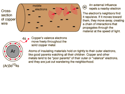 In a conductor, electric current can flow freely, in an insulator it cannot. Metals such as copper typify conductors, while most non-metallic solids are said to be good insulators, having extremely high resistance to the flow of charge through them. "Conductor" implies that the outer electrons of the atoms are loosely bound and free to move through the material. Most atoms hold on to their electrons tightly and are insulators. In copper, the valence electrons are essentially free and strongly repel each other. Any external influence which moves one of them will cause a repulsion of other electrons which propagates, "domino fashion" through the conductor.