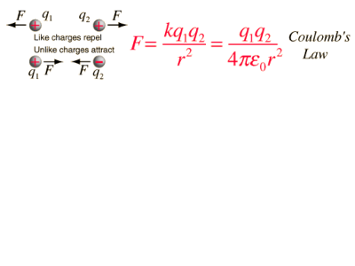 The electric force acting on a point charge q1 as a result of the presence of a second point charge q2 is given by Coulomb's Law: