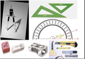 Compás,escuadra,goma,cartabón,sacapuntas,