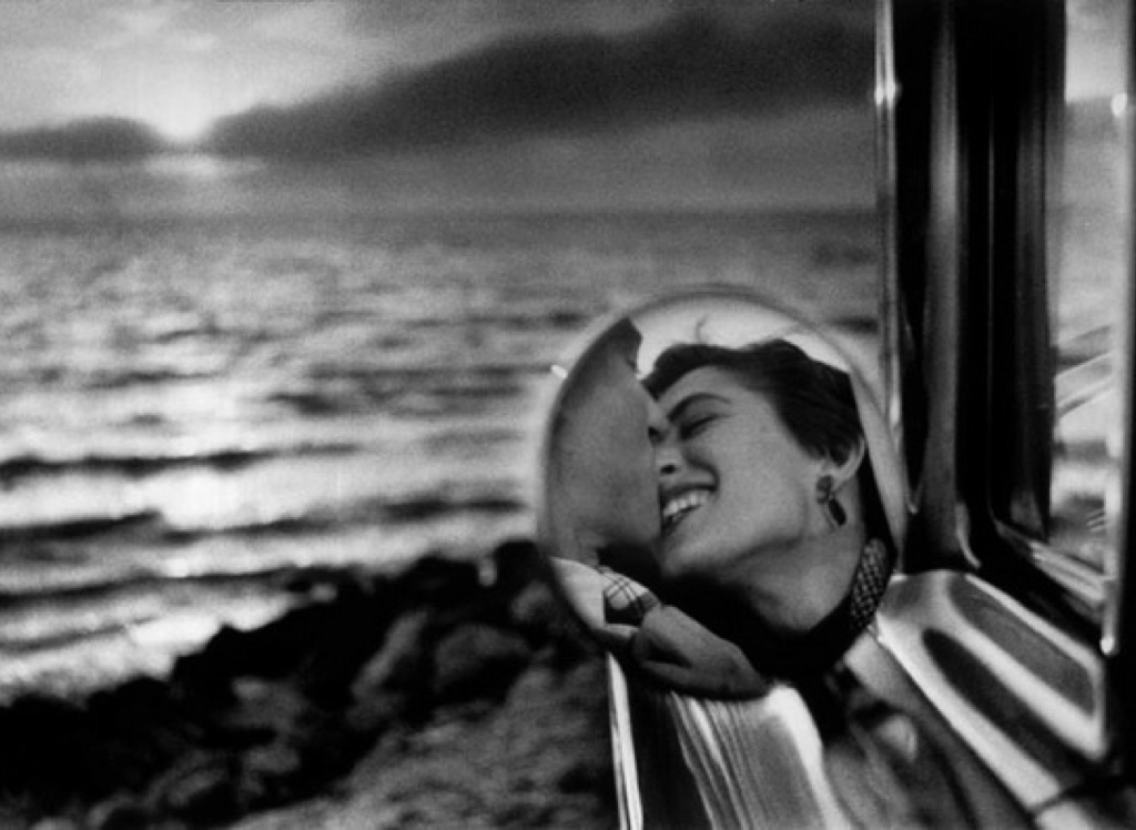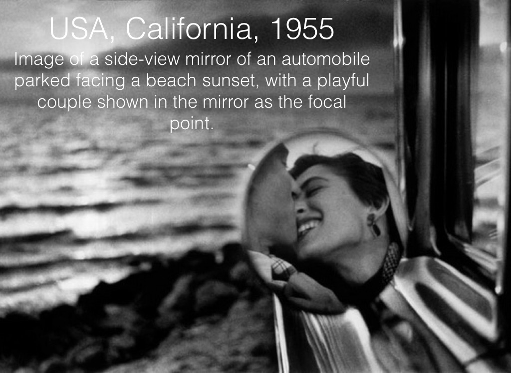 Image of a side-view mirror of an automobile parked facing a beach sunset, with a playful couple shown in the mirror as the focal point.