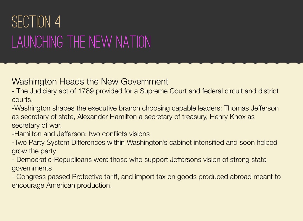 -Washington shapes the executive branch choosing capable leaders: Thomas Jefferson as secretary of state, Alexander Hamilton a secretary of treasury, Henry Knox as secretary of war.