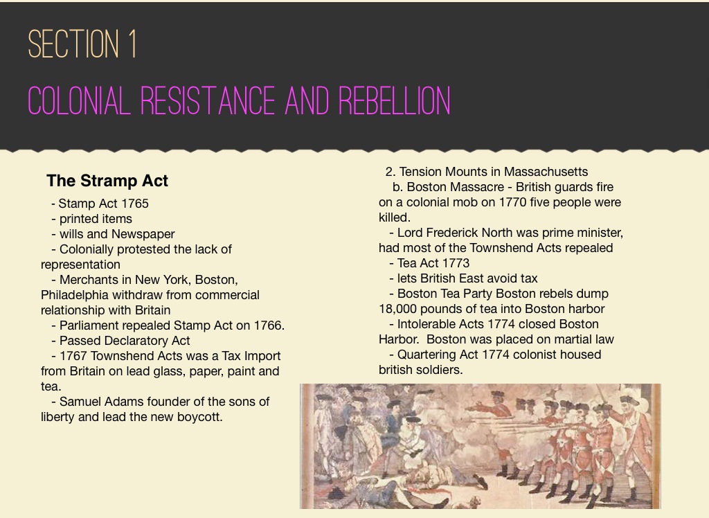 - 1767 Townshend Acts was a Tax Import from Britain on lead glass, paper, paint and tea.