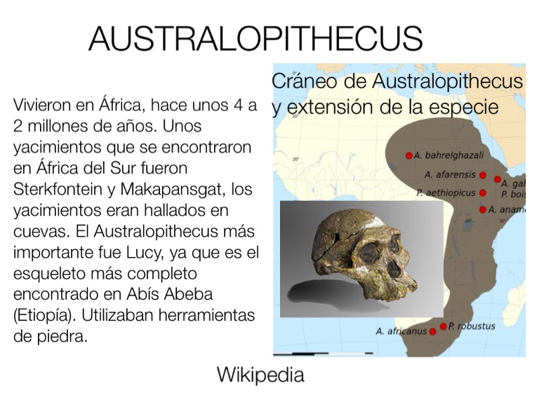 Vivieron en África, hace unos 4 a 2 millones de años. Unos yacimientos que se encontraron en África del Sur fueron Sterkfontein y Makapansgat, los yacimientos eran hallados en cuevas. El Australopithecus más importante fue Lucy, ya que es el esqueleto más completo encontrado en Abís Abeba (Etiopía). Utilizaban herramientas de piedra.