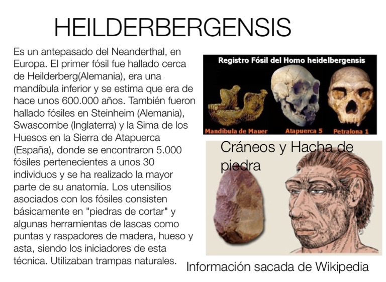 Es un antepasado del Neanderthal, en Europa. El primer fósil fue hallado cerca de Heilderberg(Alemania), era una mandíbula inferior y se estima que era de hace unos 600.000 años. También fueron hallado fósiles en Steinheim (Alemania), Swascombe (Inglaterra) y la Sima de los Huesos en la Sierra de Atapuerca (España), donde se encontraron 5.000 fósiles pertenecientes a unos 30 individuos y se ha realizado la mayor parte de su anatomía. Los utensilios asociados con los fósiles consisten básicamente en "piedras de cortar" y algunas herramientas de lascas como puntas y raspadores de madera, hueso y asta, siendo los iniciadores de esta técnica. Utilizaban trampas naturales.