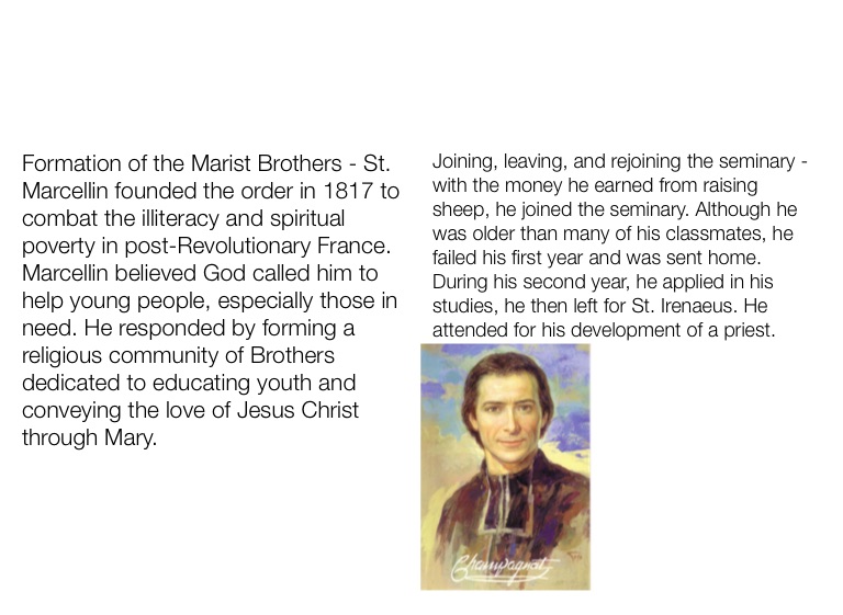 Formation of the Marist Brothers - St. Marcellin founded the order in 1817 to combat the illiteracy and spiritual poverty in post-Revolutionary France. Marcellin believed God called him to help young people, especially those in need. He responded by forming a religious community of Brothers dedicated to educating youth and conveying the love of Jesus Christ through Mary.