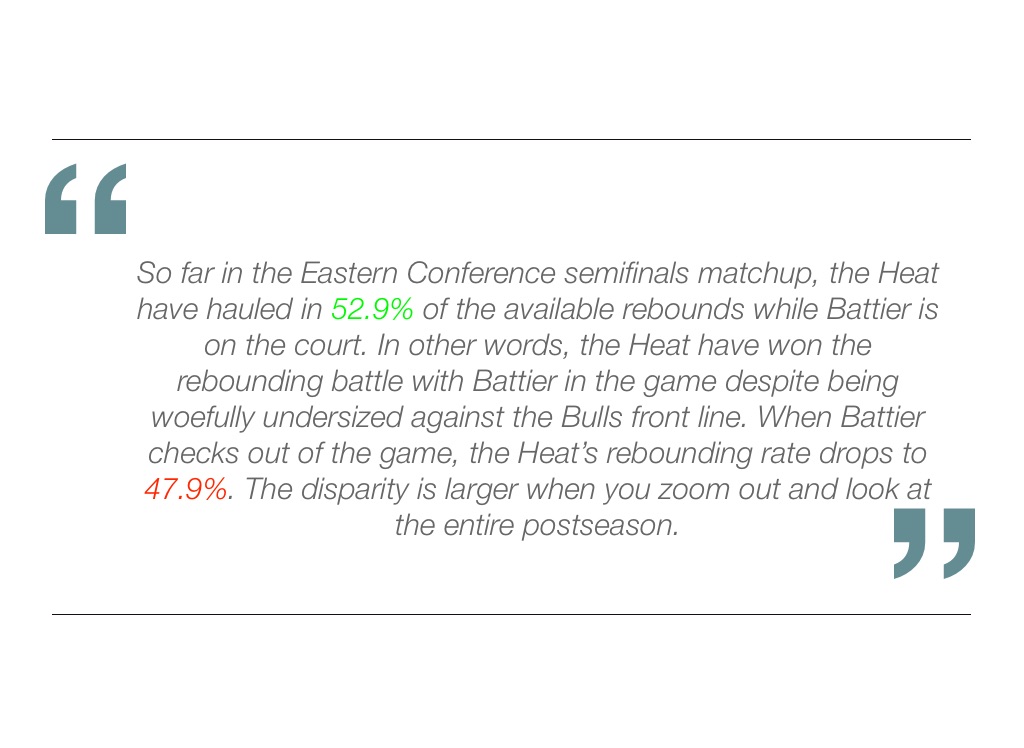So far in the Eastern Conference semifinals matchup, the Heat have hauled in 52.9% of the available rebounds while Battier is on the court. In other words, the Heat have won the rebounding battle with Battier in the game despite being woefully undersized against the Bulls front line. When Battier checks out of the game, the Heat’s rebounding rate drops to 47.9%. The disparity is larger when you zoom out and look at the entire postseason.