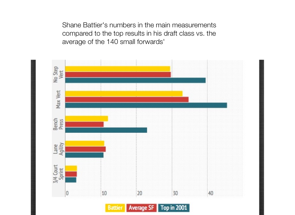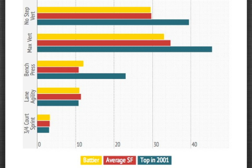 Shane Battier's numbers in the main measurements compared to the top results in his draft class vs. the average of the 140 small forwards'