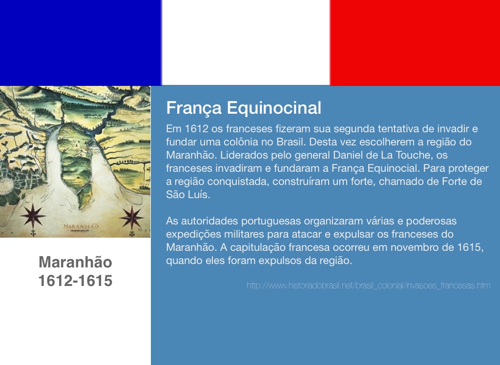 Em 1612 os franceses fizeram sua segunda tentativa de invadir e fundar uma colônia no Brasil. Desta vez escolherem a região do Maranhão. Liderados pelo general Daniel de La Touche, os franceses invadiram e fundaram a França Equinocial. Para proteger a região conquistada, construíram um forte, chamado de Forte de São Luís.