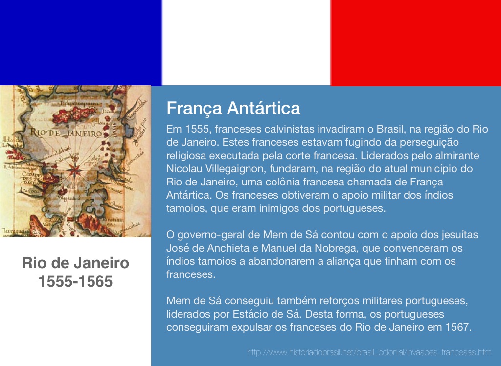 Em 1555, franceses calvinistas invadiram o Brasil, na região do Rio de Janeiro. Estes franceses estavam fugindo da perseguição religiosa executada pela corte francesa. Liderados pelo almirante Nicolau Villegaignon, fundaram, na região do atual município do Rio de Janeiro, uma colônia francesa chamada de França Antártica. Os franceses obtiveram o apoio militar dos índios tamoios, que eram inimigos dos portugueses.