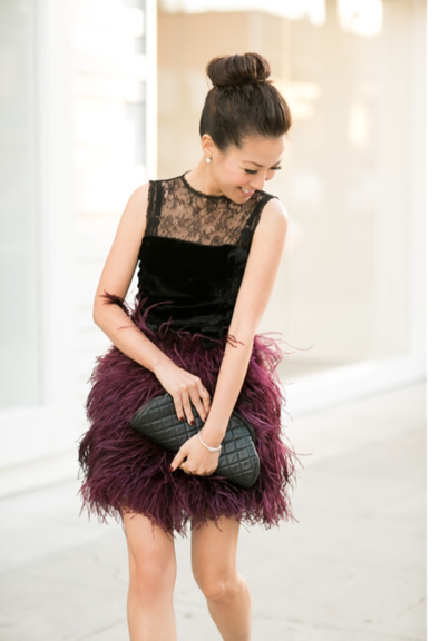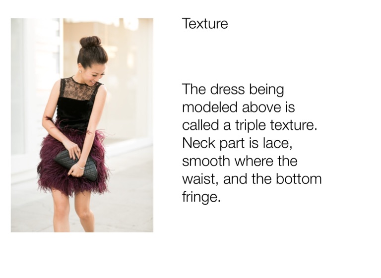 The dress being modeled above is called a triple texture. Neck part is lace, smooth where the waist, and the bottom fringe.