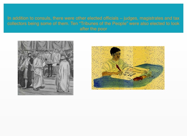 In addition to consuls, there were other elected officials – judges, magistrates and tax collectors being some of them. Ten “Tribunes of the People” were also elected to look after the poor