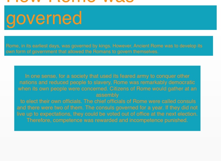 to elect their own officials. The chief officials of Rome were called consuls and there were two of them. The consuls governed for a year. If they did not live up to expectations, they could be voted out of office at the next election. Therefore, competence was rewarded and incompetence punished.