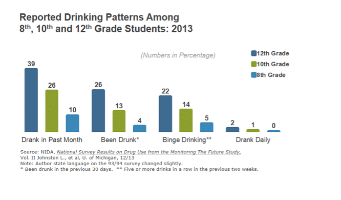 About 10 percent of eighth graders, 18 percent of 10th graders, and 24 percent of high school seniors binge on alcohol. In addition, 44 percent of college students drink this much or more at least twice a month.
