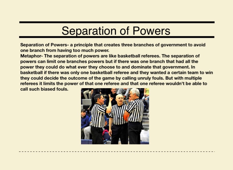 Metaphor- The separation of powers are like basketball referees. The separation of powers can limit one branches powers but if there was one branch that had all the power they could do what ever they choose to and dominate that government. In basketball if there was only one basketball referee and they wanted a certain team to win they could decide the outcome of the game by calling unruly fouls. But with multiple referees it limits the power of that one referee and that one referee wouldn't be able to call such biased fouls.