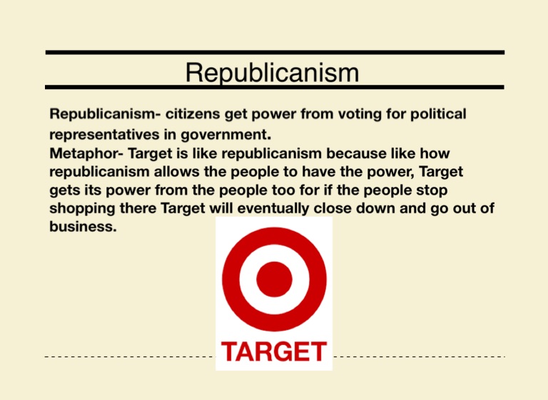 Metaphor- Target is like republicanism because like how republicanism allows the people to have the power, Target gets its power from the people too for if the people stop shopping there Target will eventually close down and go out of business.
