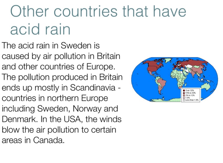 The acid rain in Sweden is caused by air pollution in Britain and other countries of Europe. The pollution produced in Britain ends up mostly in Scandinavia - countries in northern Europe including Sweden, Norway and Denmark. In the USA, the winds blow the air pollution to certain areas in Canada.
