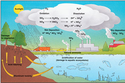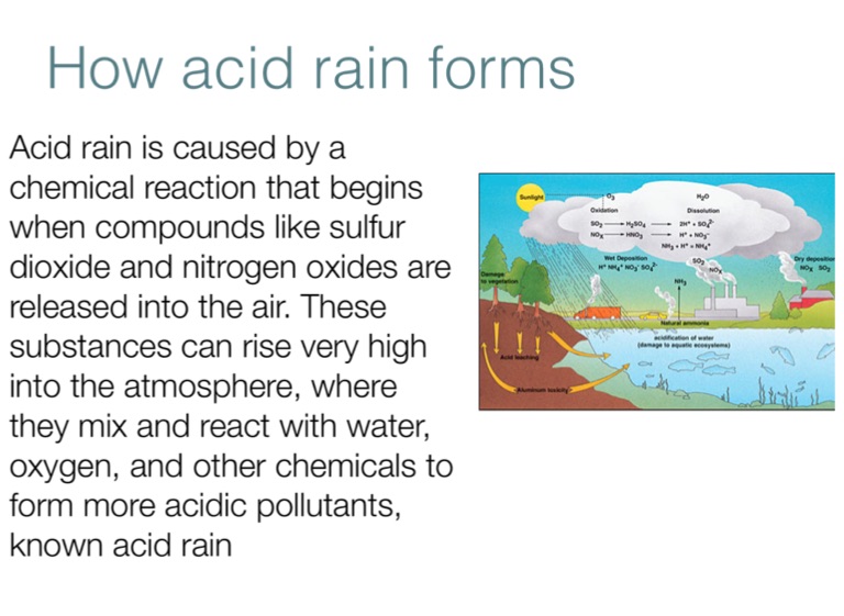 Acid rain is caused by a chemical reaction that begins when compounds like sulfur dioxide and nitrogen oxides are released into the air. These substances can rise very high into the atmosphere, where they mix and react with water, oxygen, and other chemicals to form more acidic pollutants, known acid rain
