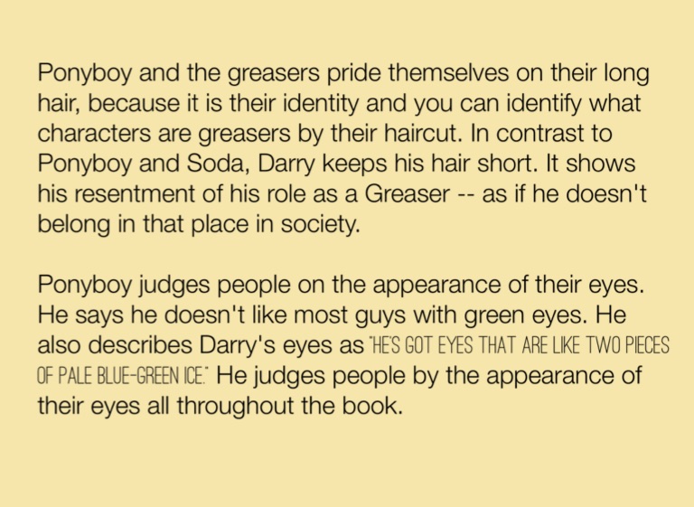 Ponyboy and the greasers pride themselves on their long hair, because it is their identity and you can identify what characters are greasers by their haircut. In contrast to Ponyboy and Soda, Darry keeps his hair short. It shows his resentment of his role as a Greaser -- as if he doesn't belong in that place in society.