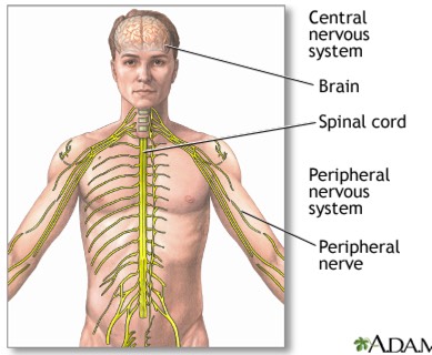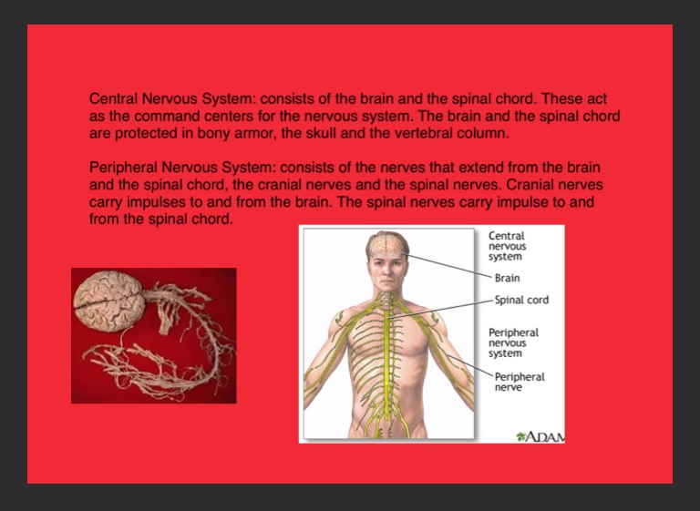 Central Nervous System: consists of the brain and the spinal chord. These act as the command centers for the nervous system. The brain and the spinal chord are protected in bony armor, the skull and the vertebral column.