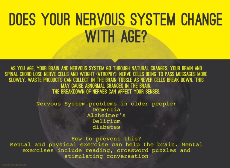 As you age, your brain and nervous system go through natural changes. Your brain and spinal chord lose nerve cells and weight (atrophy). Nerve cells being to pass messages more slowly. Waste products can collect in the brain tussle as never cells break down. This may cause abnormal changes in the brain.